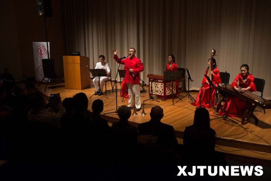 两校师生共同联袂奉献的文艺演出不仅吸引了内布拉斯加大学的师生,还吸引了当地华人慕名而来。内布拉斯加大学音乐学院博士生乐队的古典音乐联奏拉开晚会帷幕。西安交大师生演奏了《花好月圆》、《彩云追月》等传统乐曲,二胡、长笛、琵琶与古筝的经典搭配仿佛把听众带入了江南水乡,古典民乐的魅力深深吸引了在场听众,中国传统乐器合奏的美国民歌更是把晚会推向高潮。