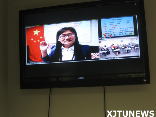 会议之前,两位院长利用下午的时间来到控制室,观看了荆琳老师正在进行中的多媒体远程汉语教学。尽管是网络授课,教师不能直观地面对学生,但是课堂上学习气氛依然浓厚热烈。让人感到惊讶的是,这些学习中文仅半年的学生们已经能够听懂老师的课堂用语,用汉语描述身边的事物,甚至能唱一些简单的中文歌了。