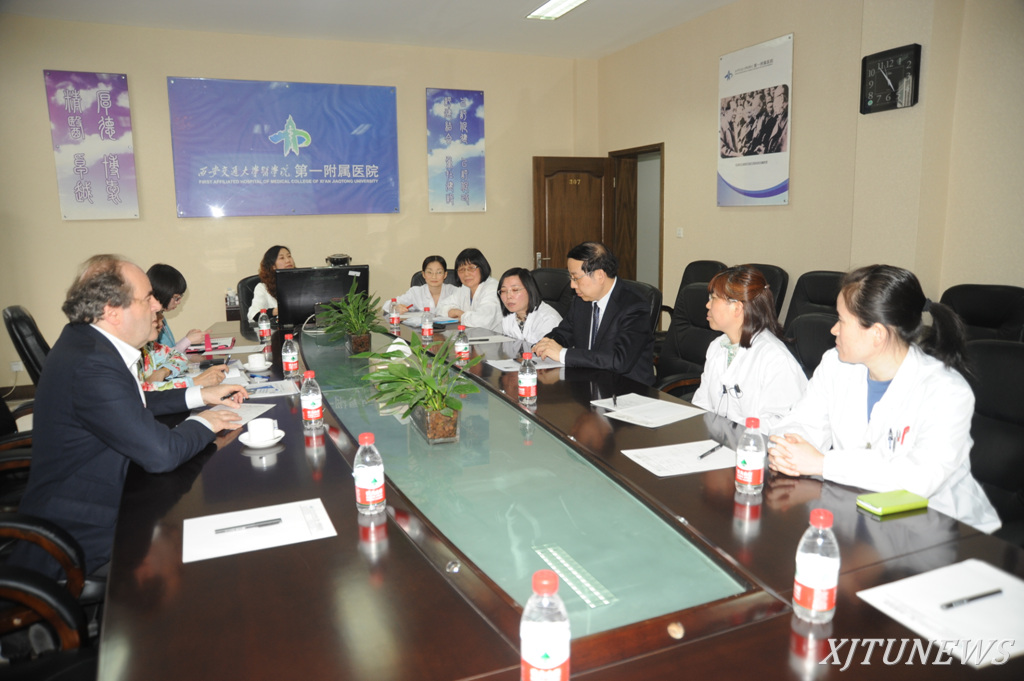 4月9日下午, 一附院院长李旭教授、公共卫生学院院长庄贵华教授会见布鲁塞尔自由大学医学院院长Yvon Englert教授和公共卫生学院张维宏教授,针对双方合作层面和合作模式展开深入讨论。会后,两位教授参观了一附院病房,与一线医生亲切交流,分享经验。