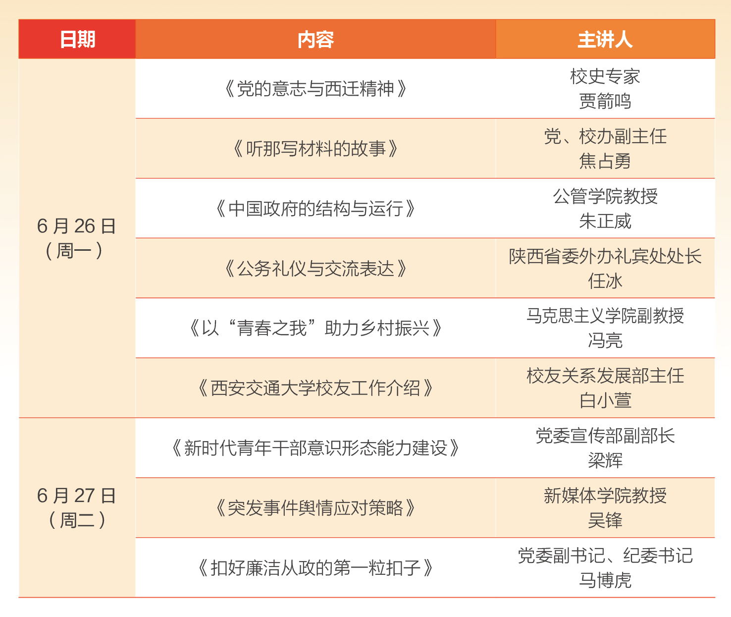 6月26日-27日,西安交通大学举办“西迁精神新传人 启程奋进新征程”2023届选调生岗前培训班。党委常委、副校长洪军,党委常委、党委组织部部长严俊杰,校史专家、档案馆原馆长贾箭鸣出席开班仪式,党委宣传部、党委学工部、党委研工部、团委、校友部等职能部门和学院书院负责人参加开班仪式,90余名选调生代表参加培训。就创中心主任郑旭红主持开班仪式。