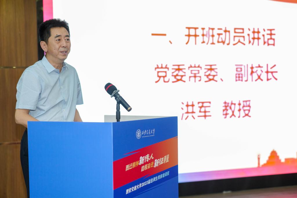 洪军向即将加入选调生队伍的毕业生们表示热烈祝贺。他表示,西安交大高度重视选调生工作,选调生是参与国家治理的重要人才,学校特别举办岗前培训,临行前帮助大家“强筋壮骨”、快速适应工作岗位。他提出“勤、思、文、言”四点要求,希望选调生们手勤、眼勤、脑勤,努力成长为党和人民忠诚可靠的干部和堪当民族复兴重任的时代新人。
