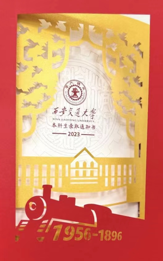 西安交通大学的录取通知书以交通大学西迁为主题,整体采用三折页内嵌形式,外层封套为录取纪念卡,封套内嵌入录取通知书。纪念卡封面为带有1956年字样的西迁专列,封二为交大西迁后建设的中心楼与栽下的梧桐树。梧桐树采用正负形设计,正形为梧桐树叶,负形也即镂空部分为报喜鸟,寓意百年交大“栽下梧桐树,引得凤凰来”。