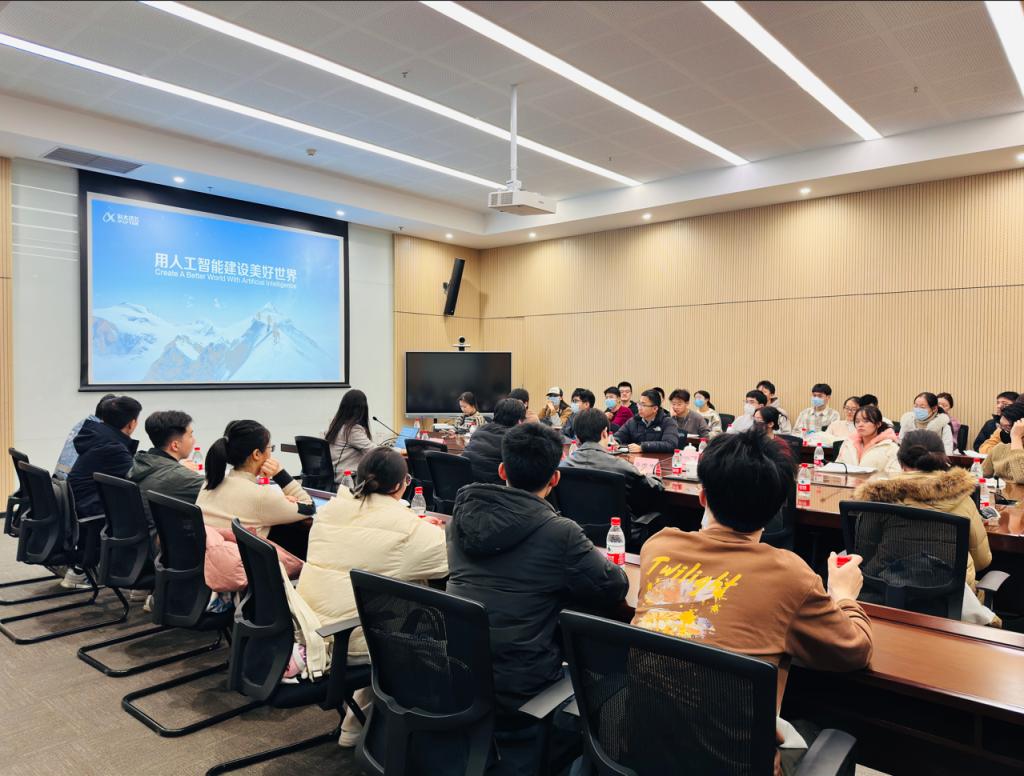 参观结束后,同学们与科大讯飞的相关负责人以及在科大讯飞工作的优秀校友进行了座谈交流。企业负责人向同学们系统介绍了科大讯飞的企业发展历程以及企业在人工智能领域的发展成果,并通过几段视频向同学们展示了科大讯飞的一系列创新产品及其应用场景。优秀校友分享了他在科大讯飞的工作情况并对学弟学妹们加入科大讯飞发出诚挚邀请,在场同学反响积极。在提问环节中,同学们踊跃提问,提出了一些关于人工智能行业发展和个人职业规划的问题,并得到了在场企业负责人详细且专业的解答和建议。负责人鼓励同学们要勇于创新、不断学习和提升自己的能力,同时也希望他们能将所学应用于实际工作中,为社会的发展做出贡献。