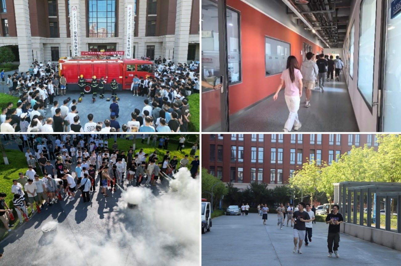 消防疏散演练正式开始。演练场景模拟某实验室因电器线路短路引起火灾,火势整楼蔓延、消防通道被烟雾封堵。“火灾事件”发生后,师生听从演练工作人员指挥,沿指定路线从实验室、学生工位有序撤离到安全场地。