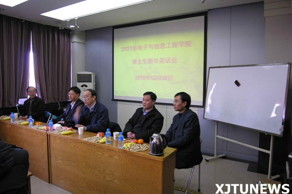 2010年12月30日上午,电信学院在西一楼第一会议室举行2011年博士生新年茶话会。电信学院院长管晓宏教授、分党委书记刘纯亮教授、副院长司金海教授、分党委专职委员杨清宇副教授、研究生教务部吴存孝老师和70余名博士研究生进行了亲切座谈。