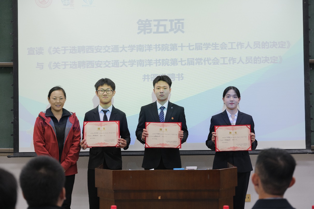 主持人宣读《关于任命西安交通大学第十七届南洋书院学生会主席团的决定》《关于选聘西安交通大学第十七届南洋书院学生会工作人员的决定》与《关于选聘西安交通大学南洋书院第七届常代会工作人员的决定》并颁发聘书。