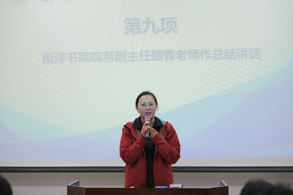 顾蓉在总结致辞中首先分享了自己初入交大的经历,鼓励同学们在学习知识的同时积极参加学生工作,同时指出“要服务好同学,就需要学生会的同学主动到同学中去,听取同学们的意见,结合新时代、新学情全心全意为同学服务”,她提出,南洋书院学生会要多在为学校建设、书院发展和同学成长成才方面有所作为,为同学们带来更多积极向上、寓教于乐的多彩活动,引领思想前沿的同时丰富同学们的校园文化生活。