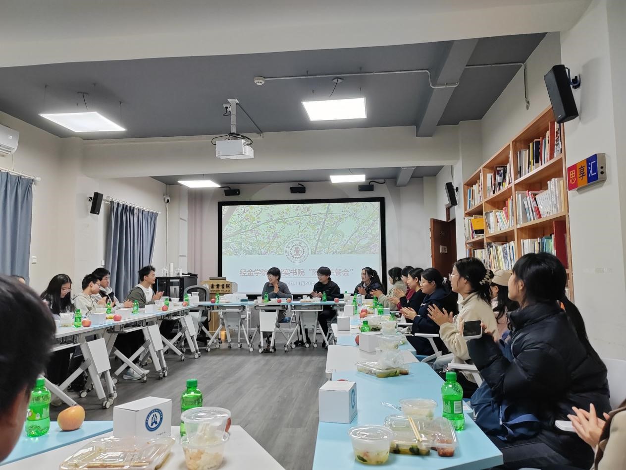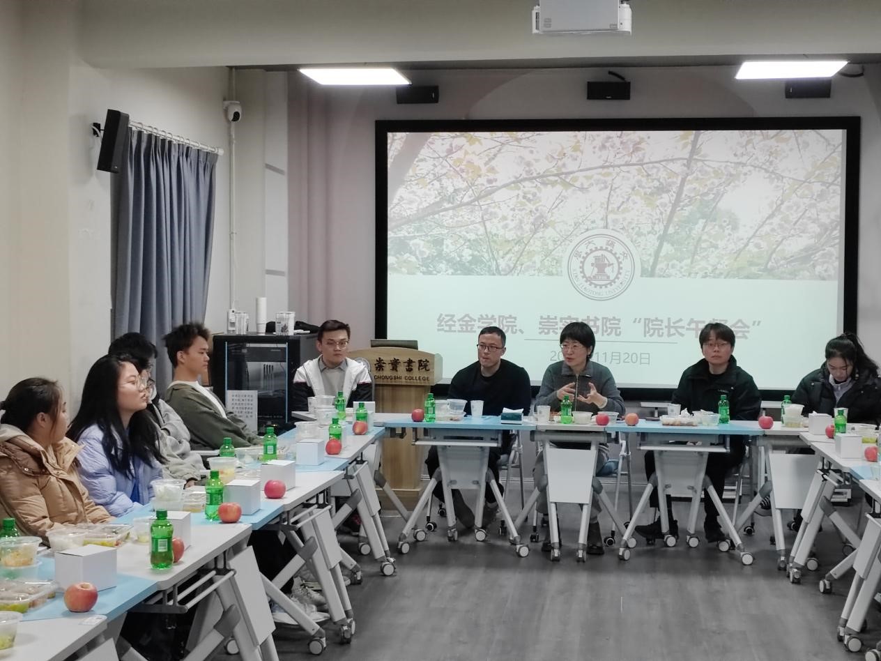 为进一步强化双院协同育人机制,更有效地促进教学资源融入书院育人实践中,崇实书院主动携手各相关学院,精心组织了一系列“院长午餐会”活动,旨在为师生搭建一个温馨且高效的对话空间。近日,经济与金融学院与崇实书院联合举办了这样一场意义非凡的“院长午餐会”。活动中,经济与金融学院副院长赵春艳、崇实书院院务主任段继超以及辅导员李永鼎、吴鸽、刘凯,与来自经济学、经济统计学、金融学及电子商务等专业的20名学生欢聚一堂。