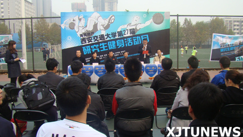 11月10日下午4点,第27届西安交通大学研究生健身活动月开幕式在东篮球场隆重举行。校研究生院常务副院长陈天宁教授,体育中心、学生处、校团委相关负责人,以及赞助本届健身活动月的宁夏海亮房地产有限公司人事行政部经理黄福一行莅临开幕式现场并观看揭幕战。