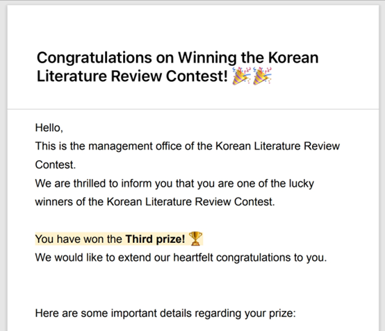 对于本次参赛及获奖,谢思祺谈道:“本科阶段第一次参与国际赛事,获得了许多宝贵的经验。比如如何在外文网站查询资料、独立按要求完成作品并提交,同时也要感谢班主任古栋老师的帮助和指导;此次参赛不仅扩展了自己在文学上的兴趣、提高了写作能力,也激励着初入高等学府的自己敢于尝试、多元发展。学校和学院给我们提供了高水平的平台,大学阶段有各种各样的机会,都可以去了解、涉猎,努力做到最好。另外,通过对韩国当代文学的阅读和思考,感受了多元文化碰撞的魅力,意识到了青年在国际文化交流和发展中的责任。正如我在参赛作品结尾写到的——中国古代诗人白居易以霞光比拟友情,希真和路易眼中的霞光也一样跨越千万里之遥。我们东方文学折射出的伦理价值观,对人际关系的重视、对情感的无条件倾斜、对人性的凸显和讴歌——初识韩国文学,最让我动容的正是这样一种遥远的相似性、这样一种历久弥新的伟大。”