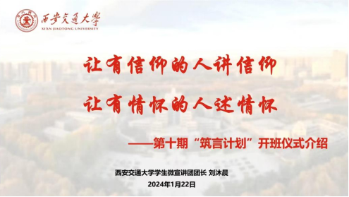 为深入学习贯彻习近平新时代中国特色社会主义思想,切实增强做好新时代新征程宣传思想文化工作的责任感使命感,引导广大青年在真学真懂真信真用、深化内化转化上下功夫,近日,西安交通大学学生微宣讲团联合筑梦社于寒假期间举办第十期“筑言计划”宣讲训练营。目前,14场理论、技能培训圆满结束,取得良好反响。