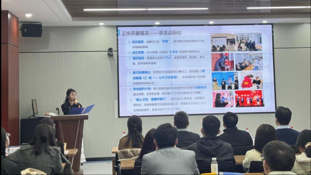 公共卫生学院党委副书记岳甜对话剧社的工作成果表示肯定。作为承璞话剧社的成长见证人,她提出话剧社的创办为思政教育提供了新方法、新途径。未来话剧社也要将殷培璞教授“大医精诚,扎根基层,厚德济明,卫戍健康”精神代代相传。