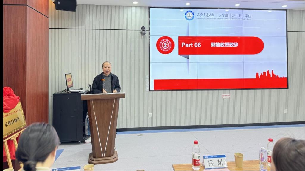 郭雄教授介绍了殷培璞教授的生平事迹,回忆了2018年孙春兰副总理前往麟游县视察大骨节病防治工作,强调殷培璞教授“由治转防”的重要意义,期望话剧社未来将殷培璞教授信念坚定、对党忠诚、情系百姓、扎根基层、严谨治学、精益求精的伟大精神传承发扬。