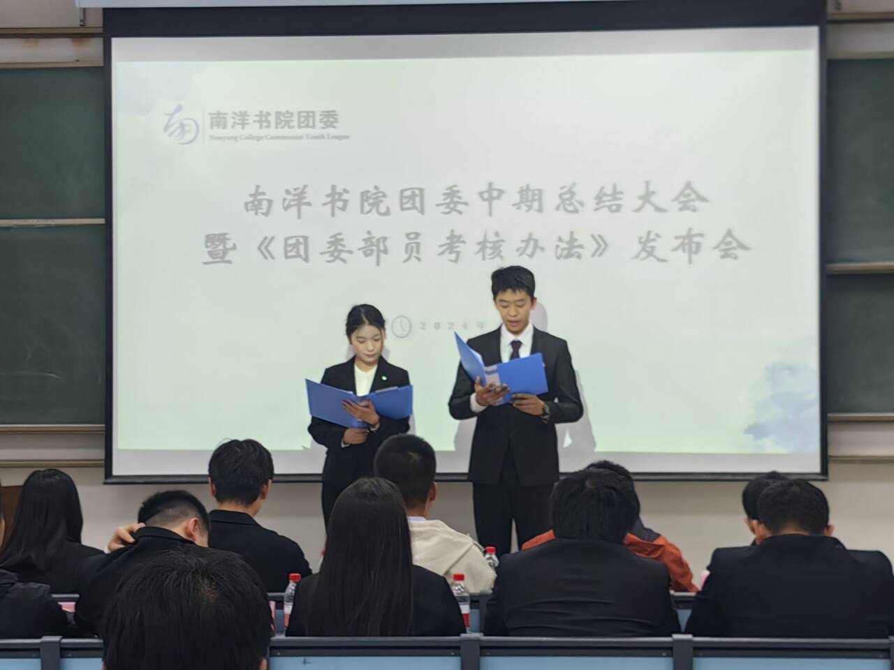 近日,共青团西安交通大学南洋书院委员会中期总结大会暨南洋书院《团委部员考核办法》发布会在主D205教室召开。南洋书院团委书记张博、副书记胡可勰参加会议,南洋书院学生会代表、各书院团委代表等列席会议。