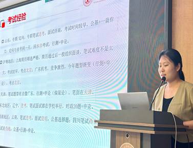 江苏省选调生张皓月从江苏选调的选调条件、选调流程、选调岗位及其报录比情况、笔试题型等为同学们进行细致的分享。她提到在前期准备笔试部分要选择适合自己的资料,针对性地学习专项课程,大量练习相关习题,保持良好心态。后期考察部分要对专业学习的收获、学生工作经历、时事政治的积累、论文和专业比赛等个人经历进行梳理,多和同学进行模拟练习。
