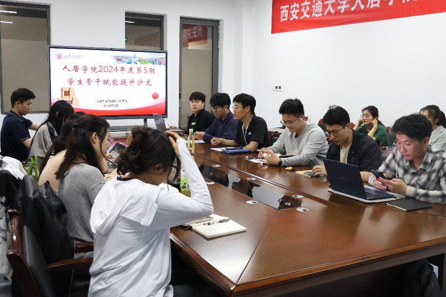 为全面落实立德树人根本任务,加强研究生骨干队伍素质提升和专业化建设,5月29日晚,人居学院在创新港举办2024年度第5期学生骨干赋能提升沙龙,人居学院研究生辅导员薛同宣及全体研究生兼职辅导员、学生骨干参加活动。活动由兼职辅导员郭筱洋主持。