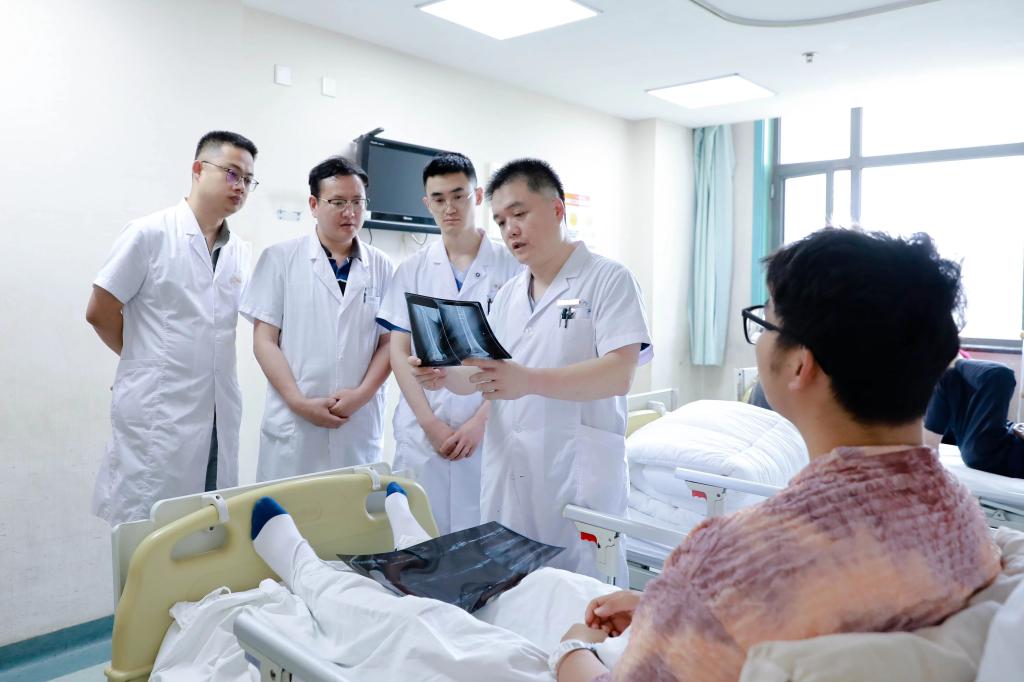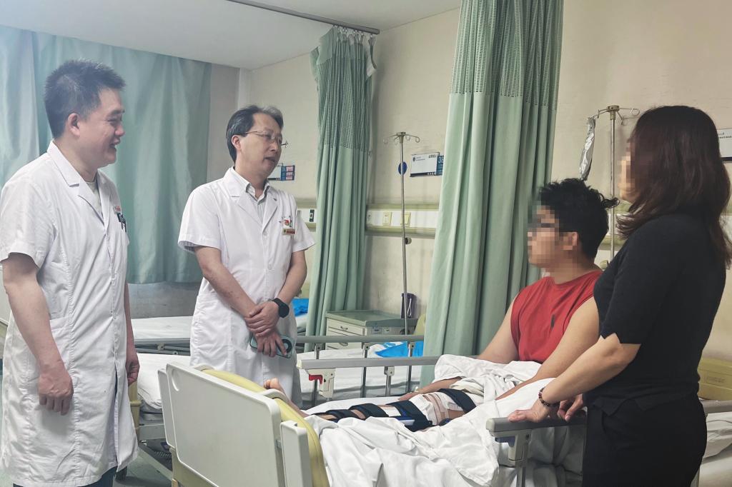 患者小张(化名)4月28日深夜外出时不幸遭遇车祸,腿部受伤严重,疼痛和失血使得他逐渐陷入意识模糊状态,情况十分危急,被120紧急送往附近多家医院。然而,由于伤情严重,救治难度大,医院均建议截肢保全或转院治疗。紧急时刻,小张班主任迅速向学校汇报了情况,学校学生处、崇实书院领导高度重视,立即与二附院党委副书记滕文葆和副院长刘明取得联系,滕文葆当即指示二附院骨科中心运动医学科与急诊科,即刻开通绿色通道等待患者送达,校院联动为挽救生命争分夺秒。