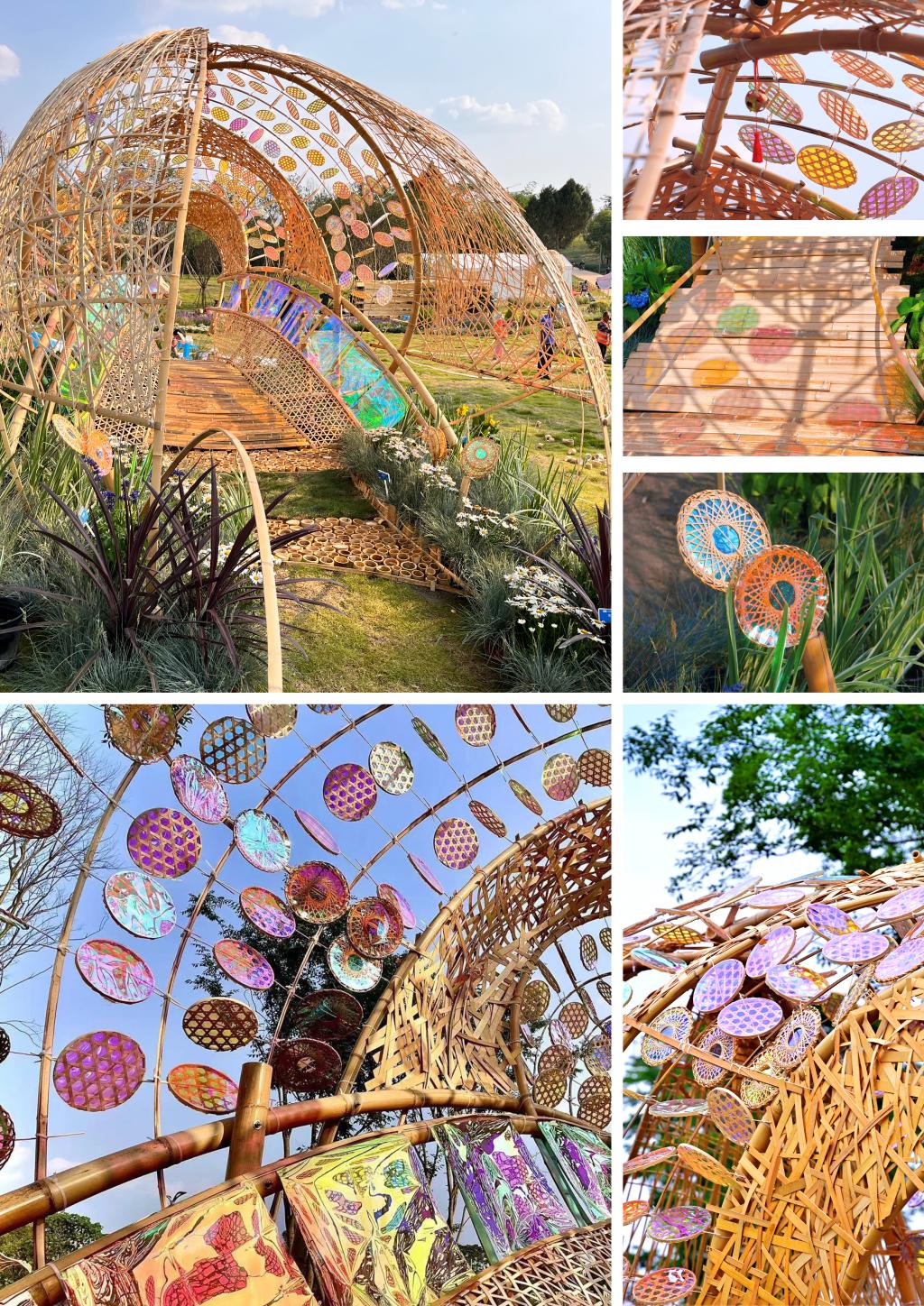 设计理念:本装置以川渝特有的网翅蝉为灵感,仿造其展翼欲飞的形态。我们观察并提炼出网翅蝉的形状、色彩、动态及其含义,以竹材状写羽化新生之态,配合镭射纸描绘出幻彩之翼,三者的结合谱写出无限美好。一圈圈圆竹有序排列,环绕出蝉中空的躯干,镭射纸风车在阳光下流光溢彩,可容纳多人休憩、游玩、祈愿;底部微抬的一座圆竹小桥作为通道,模拟蝉依附的树干,也是通向美好未来的多彩之路;错综复杂的蝉翼骨架由竹片构成,并以竹篾编织出其脉络,蝉翼层好似天然的顶棚,庇护游人遮阴,阳光透过格隙又在地上投影出斑斑点点。整体造型轻盈灵动,仿佛就要乘风而起,翾翾翩飞,去拥抱美好。