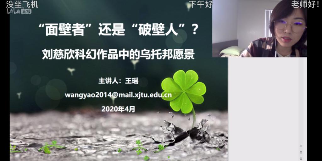 4月11日上午,崇实书院杏坛讲学开讲,人文学院中文系副教授王瑶应邀作主题为“刘慈欣的科幻创作”的讲座。本次讲座是新生养成教育以及青马团校主题讲座之一,通过哔哩哔哩线上平台直播,获得了一致好评。