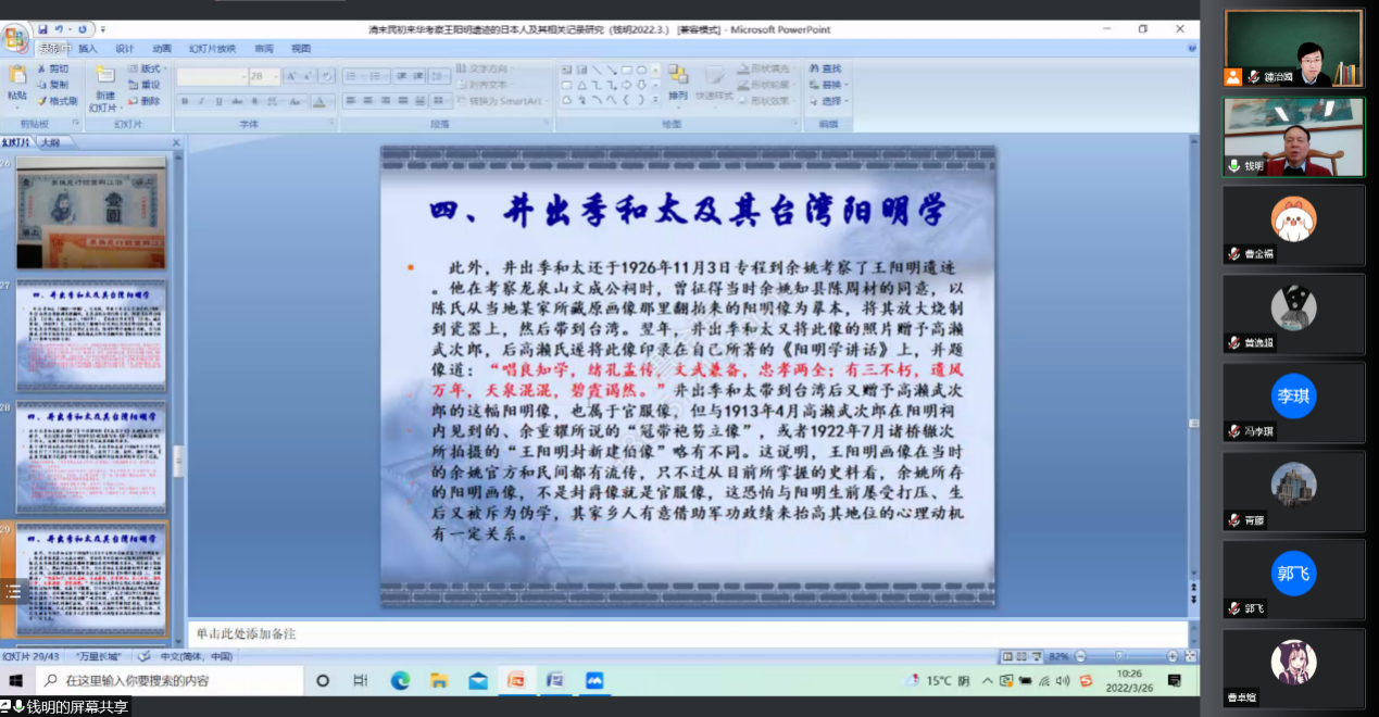 西安交通大学哲学系“彭康哲学讲坛”第18期学术报告“清末民初来华考察王阳明遗迹的日本人及其相关记录之研究”3月26日上午在线上举行。报告由浙江省稽山王阳明研究院副院长、浙江工商大学东亚阳明研究院院长、浙江省社会科学院研究员钱明老师主讲,西安交大哲学系副教授钟治国主持。