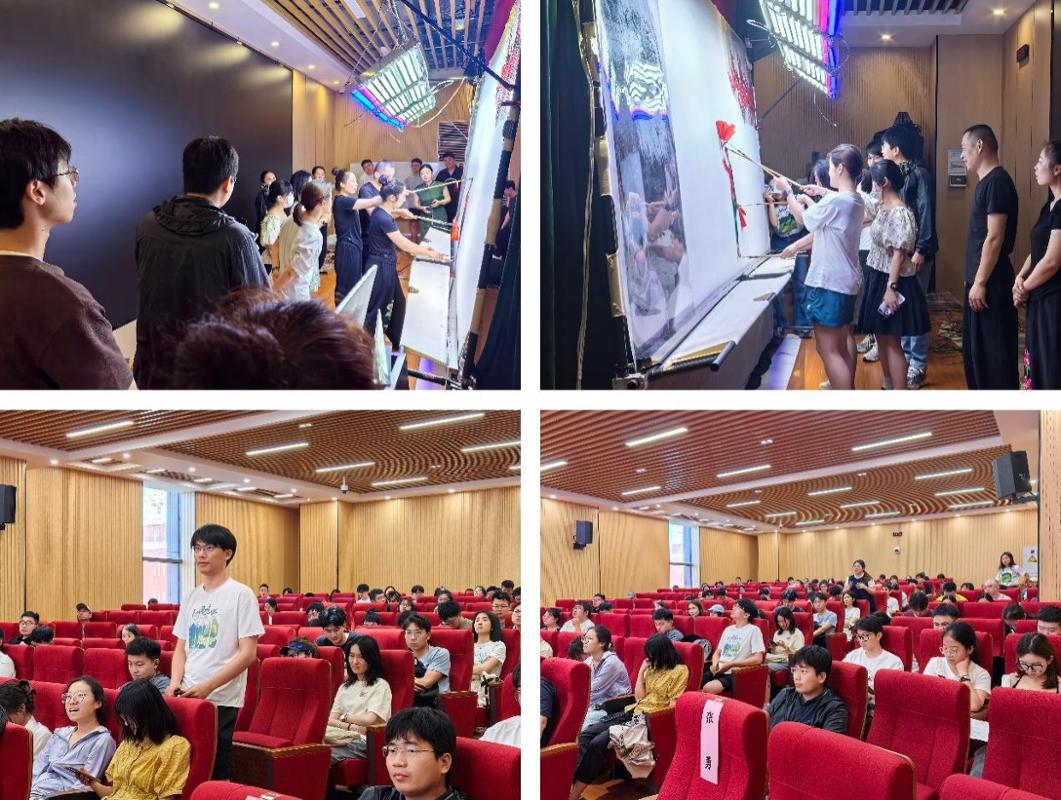 在展演环节,薛宏权老师团队为交大师生表演了皮影剧目《老鼠偷油》,表演诙谐生动、耐人寻味,生动展现了老鼠与两只猫的形象;第二场剧目《白毛女》表现了杨白劳与喜儿的父女亲情,表演结束后老师现场指导学生来到幕后体验皮影表演;第三场剧目《复活的迈克》展示了已故国际巨星迈克尔杰克逊的舞台风采;第四场剧目《丝路风》展现了大漠驼铃、敦煌飞天、长河落日,光影变幻美轮美奂;第五场剧目《惩恶扬善小哪吒》展现了哪吒与龙王的打斗场面,法宝变化、动作交替十分优美。
