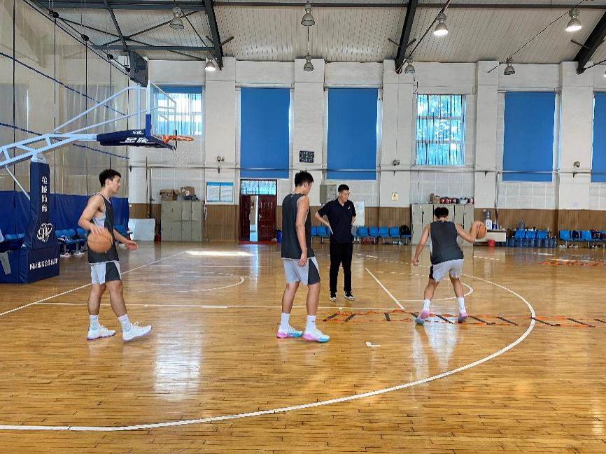 当记者来到体育中心篮球训练场时,教练董亚光正带领10余名队员进行日常训练,热身、加速投篮、折返跑……几轮高强度运动下来,队员们已经大汗淋漓,汗水顺着贴在额头的碎发滴在下巴,衣服也都已经浸湿。直至训练结束,记者采访了赵晨曦、张力升和葛作壮三位队员及教练员董亚光,并网络连线了两位主力队员孙府宽、卢杜伟。