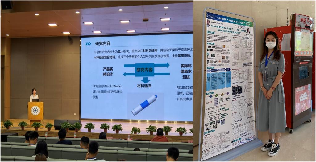 研究生期间,她聚焦主责主业,身为环境人,始终不忘习近平总书记“生态兴则文明兴,生态衰则文明衰”的殷殷嘱托,作为全球环境变化研究院的一分子,将自身研究方向与“共谋全球生态文明建设,深度参与全球环境治理”的目标紧密结合。她独立设计研发“生命吸管”——一种便于随身携带的环境原水净水装置,并获得专利授权。她关注环境问题与城市发展,基于地理信息系统,以气候、空气质量、水环境和环保产业等要素为例,对西安市的人居环境空间特征进行了分析研究,为家乡的城市建设和发展提出了可行性建议。郭瑾萧注重科研创新和学术交流,在“腾飞杯”“互联网+”等科创竞赛中多次获奖,连续两年参加“研究生创新论坛”,并做口头汇报和展板报告。研究生期间以第一作者公开发表学术论文2篇,申请发明专利2项。