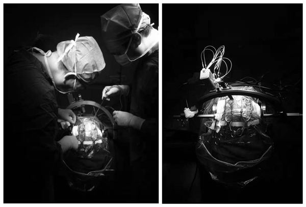 2019年8月30日清晨,二附院神经外科屈建强教授、周乐副教授、张熙副教授在手术室里紧张地忙碌着,他们正在为一名帕金森患者进行脑深部电极植入术,这是二附院首次开展该手术。该手术创伤极小,只需要将一根和绣花针一样细的电极插入脑内特定核团,然后在锁骨下方安装脉冲发射器,也就是我们俗称的电池,最后将电极和电池连接起来即可。