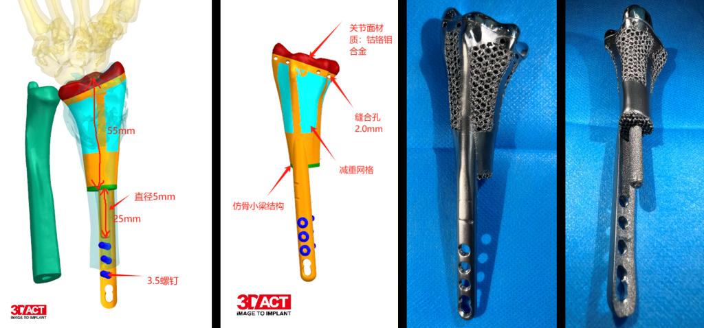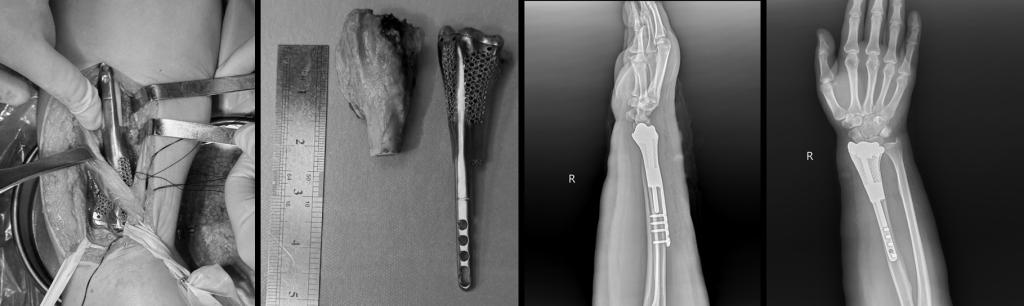 赵波副教授介绍,骨巨细胞瘤是一种良性的、有局部侵袭性的肿瘤,占骨的原发肿瘤的4%-5%,骨良性肿瘤的22.7%,常表现为疼痛,肿胀,有压痛。对大多数骨巨细胞瘤患者来说,外科手术治疗是目前主要的治疗方法,其中又以病灶扩大刮除、瘤腔灭活、骨水泥填充为主要手术方式。但是该患者骨巨细胞分级达Ⅲ级,肿瘤边界不清、有骨皮质破坏,使用病灶刮除的方法可能无法完整清除病灶,且极有可能进一步破坏皮质骨,导致病理性骨折和肿瘤转移。经过二附院骨与软组织肿瘤MDT团队会诊后,决定给予患者3个月的地舒单抗治疗后,采用桡骨远端肿瘤完整切除3D打印桡骨重建的手术。