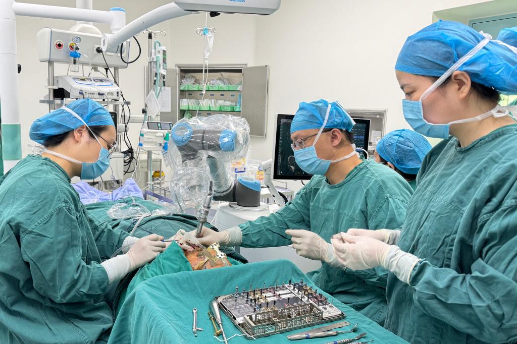 在手术中,李奇副主任医师顺利在患者颅骨外固定手术标记物,拍摄螺旋CT后确认固定标志物的钉子穿透颅骨第一层骨皮质到达第二层骨髓腔,位置精准。麻醉科王智主任在患者清醒状态下进行了经鼻纤支镜麻醉,仅用时不到15秒一次成功,保证患者插管时血压和心率平稳。随后,将术前CT、术前规划、患者颅颌骨位置及机器人机械臂进行配准标定。杜良智主任团队通过机器人亚毫米级的定位方式,精准控制避开固定腓骨的钛板和钛钉,用时三小时,顺利将6颗种植体植入规划位置,确保种植体按预设位置准确就位,为后期修复上颌缺失牙列打下基础。
