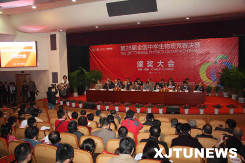 11月2日晚,在交大教学主楼多功能厅举行竞赛颁奖大会,陕西省副省长朱静芝、西安交通大学党委书记王建华、全国中学生物理学竞赛委员会顾问、北京大学教授丛树桐、全国中学生物理学竞赛委员会主任、北京大学教授林纯镇、陕西省教育厅副厅长吕明凯、陕西省科协副主席韩开兴、西安交通大学副校长程光旭、全国中学生物理学竞赛委员会常委、南开大学教授宋峰、陕西省教育厅基础教育二处处长张荣祖、陕西省物理学会秘书长白晋涛、西安交通大学理学院院长李福利、西安市教育局副局长黄新南、碑林区教育局党委书记汤伟华、局长赵六杰等出席颁奖晚会。