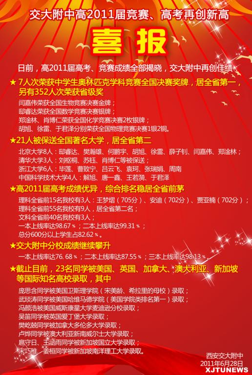 日前,高2011届高考成绩揭晓,西安交大附中成绩优异,综合排名位列全省前茅。