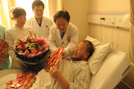 1月30日上午,当一附院泌尿外科的医护人员把一束鲜花、一盘水果和三个“福”字送到病房时,躺在床上的哈萨克斯坦“陕西村”62岁的伊斯毛用地道的陕西话说,“稀罕得很,稀罕得很,大家快坐”并招呼他的大儿子苏里杩接待大家。