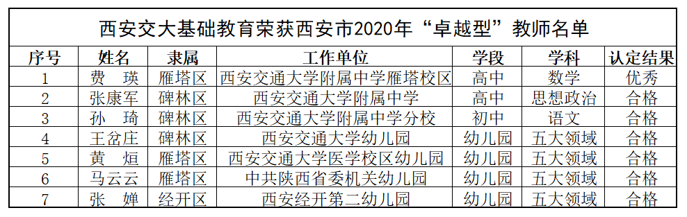 近日,西安市教育局发布《关于授予西安市2020年“卓越型”“骨干型”教师称号》的通知。基础教育党委、社会教育管理处严把资格审核关,组织、推送一批优秀的附属中小学、幼儿园教师积极申报。西安交大基础教育系统7名教师获西安市“卓越型”教师称号,19名教师获西安市“骨干型”教师称号。
