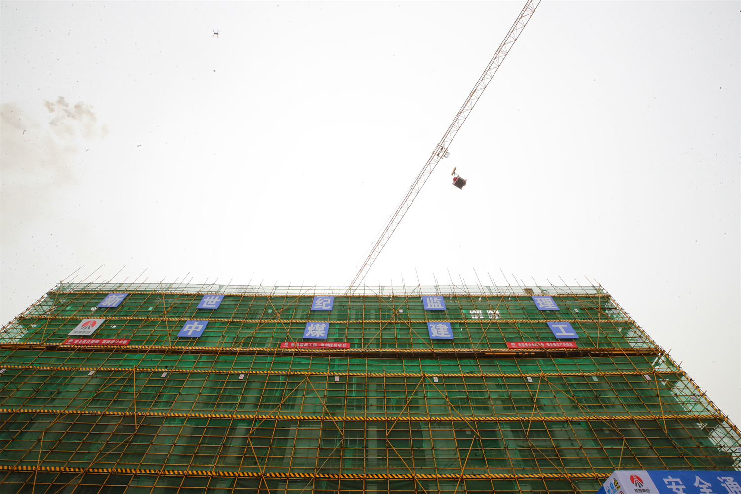 参加仪式的领导、来宾共同完成西九楼主体结构最后一方混凝土浇筑。随着装有最后一方混凝土的箱子被吊装到楼顶,西九楼项目主体建设顺利封顶。仪式结束后,与会领导、来宾参观建筑工地并对后期施工建设提出了意见建议。