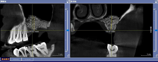 患者彭女士,左上第一磨牙缺失10余年,第二磨牙松动,无法进食。她关注到援藏专家在地区人民医院技术援助种植修复,就期盼通过种植手术修复缺失的牙齿。来自西安交通大学口腔医院的陈诚医生对其CT影像进行评估后,发现她的缺牙区骨垂直高度不足3mm,第二磨牙周围的牙槽骨也吸收到了上颌窦底,常规种植的希望渺茫。