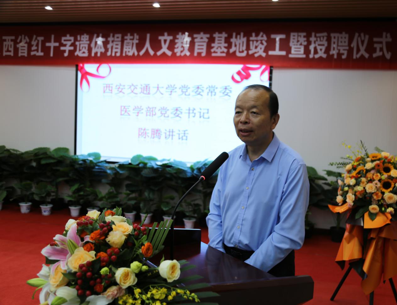 西安交通大学党委常委、医学部党委书记陈腾代表学校致辞,陕西省红十字遗体捐献人文教育基地竣工标志着学校遗体捐献工作迈上新台阶,开启了新征程。他指出,西安交通大学医学教育始终注重医学生的人文教育,教育学生要做有温度的医生,今天的活动更是一场生动的医学人文教育课,遗体捐献就是非常好的传递爱的形式。感谢陕西省红十字会以及社会各界爱心人士多年来对西安交通大学医学教育的支持,更好地发挥陕西省红十字遗体捐献中心重要作用。