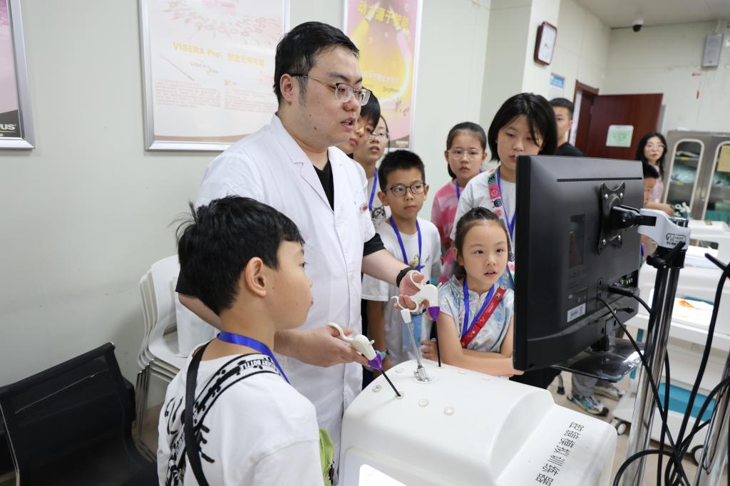 在腔镜模拟训练教室,普通外科主治医师尚皓手把手教孩子们体验了外科手术基本操作。看似简单的“夹豆子、穿线”,在腔镜下仿佛变成了不可能完成的任务,孩子们切身体会到了外科医生们的不易,只有日复一日的刻苦训练,才能登上手术台,为更多人解除病痛。
