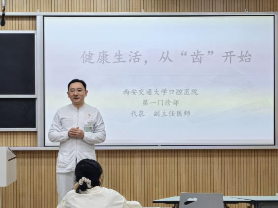活动伊始,西安交通大学口腔医院第一门诊部副主任医师代泉作题为“健康生活,从齿开始”的口腔保健知识讲座,结合其丰富的专业知识和临床经验,为师生讲解了牙齿的基本知识、常见口腔疾病的预防与治疗、保护牙齿的重要性等。