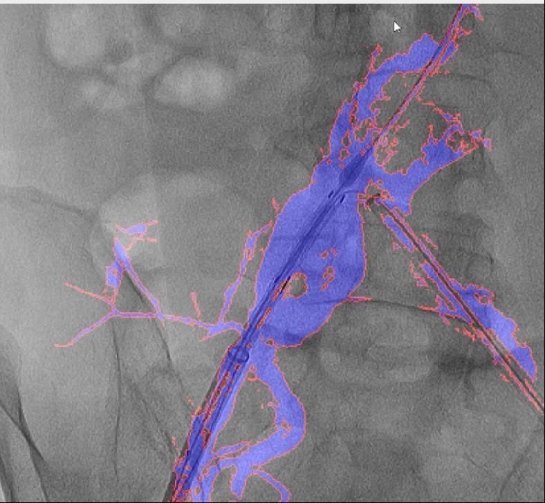本研究案例使用10ml造影剂一次造影,实现EVAR术中髂内动脉重建,图中蓝色部分为造影显示的真实血管,红色边框为图像分割结果,融合图像的透明度可调节,与真实血管完全贴合,血管、器械的细节都清晰可见。