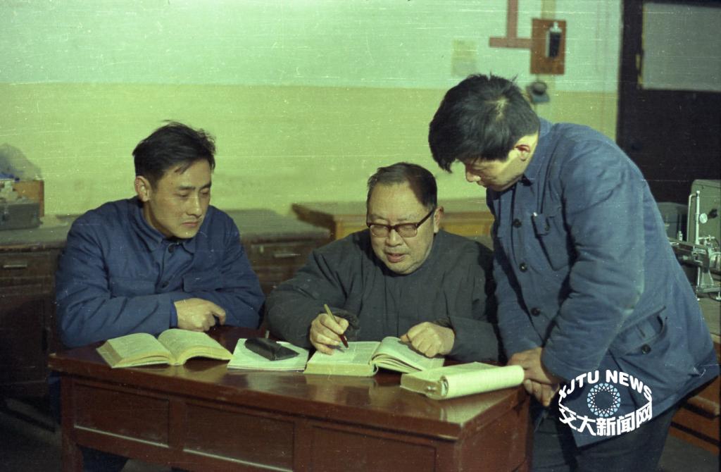 1981年11月3日,国务院首批批准固体力学唐照千,机械制造乐兑谦、顾崇衔,液压传动及气动阳含和,金属材料强度及热处理周惠久,工程热物理杨世铭,热能工程陈学俊,流体机械及流体动力工程苗永淼,电器王其平、王季梅,电力系统及其自动化孙启宏,电工绝缘技术刘子玉、刘耀南、陈季丹,电磁场与微波技术黄席椿,自动控制沈尚贤,系统工程胡保生等13个博士点共17位博士生指导教师。批准计算数学等31个硕士点。图为黄席椿教授(中)在指导学生