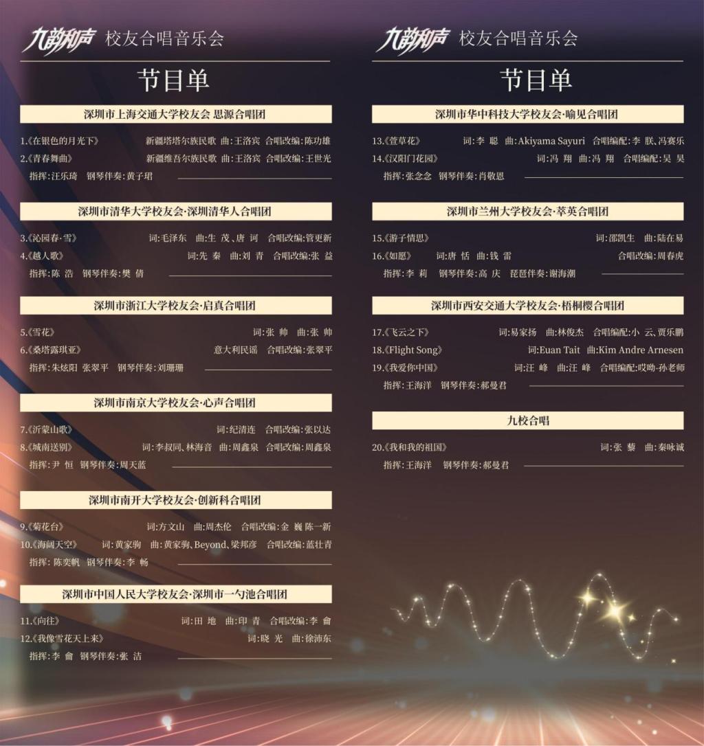 据悉,“九韵和声”音乐会今年是首次演出,以后每年举办一次。以上九所高校的深圳校友合唱团有的由来已久,有的刚刚起步,他们传承于高校合唱团,由校友中的歌唱爱好者自发组建,定期组织合唱训练及演出,因此每一支队伍都是一个高水平的合唱团,“九韵和声”高手联袂,可谓一场不可多得的音乐盛宴,更是一场情感的交融,校友们通过音乐,怀念青春岁月,展望美好未来!