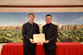 刘丰贤校友与邢晓强签署捐赠协议,孙早向刘丰贤校友赠送捐赠纪念铭牌。