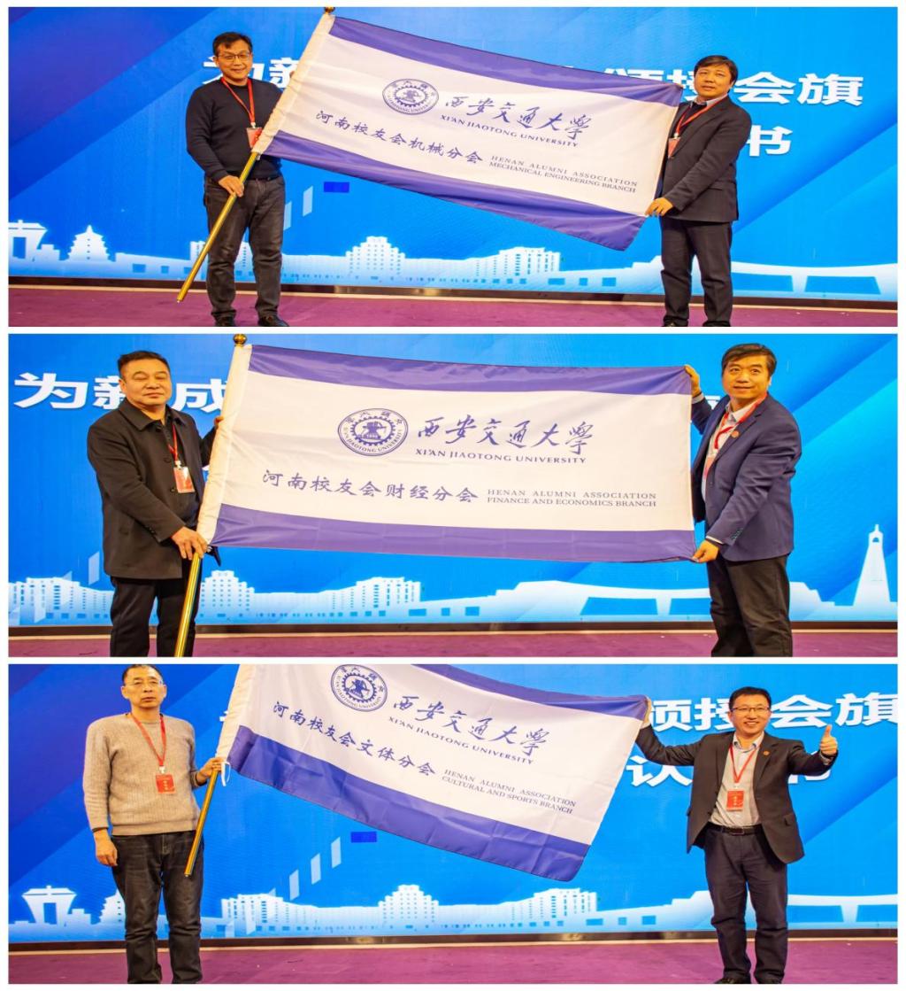 会上,为河南第四届理事会成员颁发荣誉证书,张俊斌、周建伦、许佳辉分别为河南校友会机械分会、财经分会、文体分会授会旗。