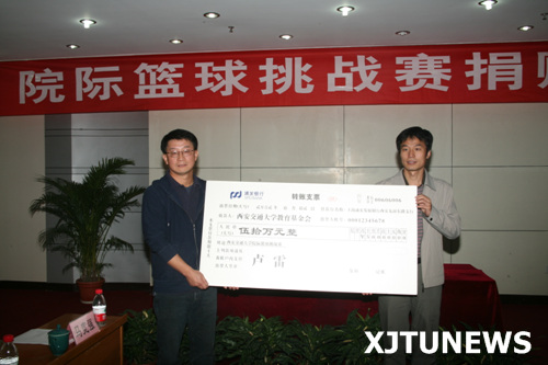 卢雷校友(左)向西安交大院际篮球挑战赛捐赠50万元