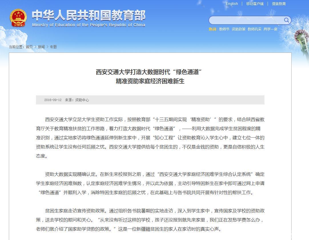 教育部门户网站,全国学生资助管理中心以“西安交通大学打造大数据时代‘绿色通道’ 精准资助家庭经济困难新生”为题报道了我校经济资助工作。
