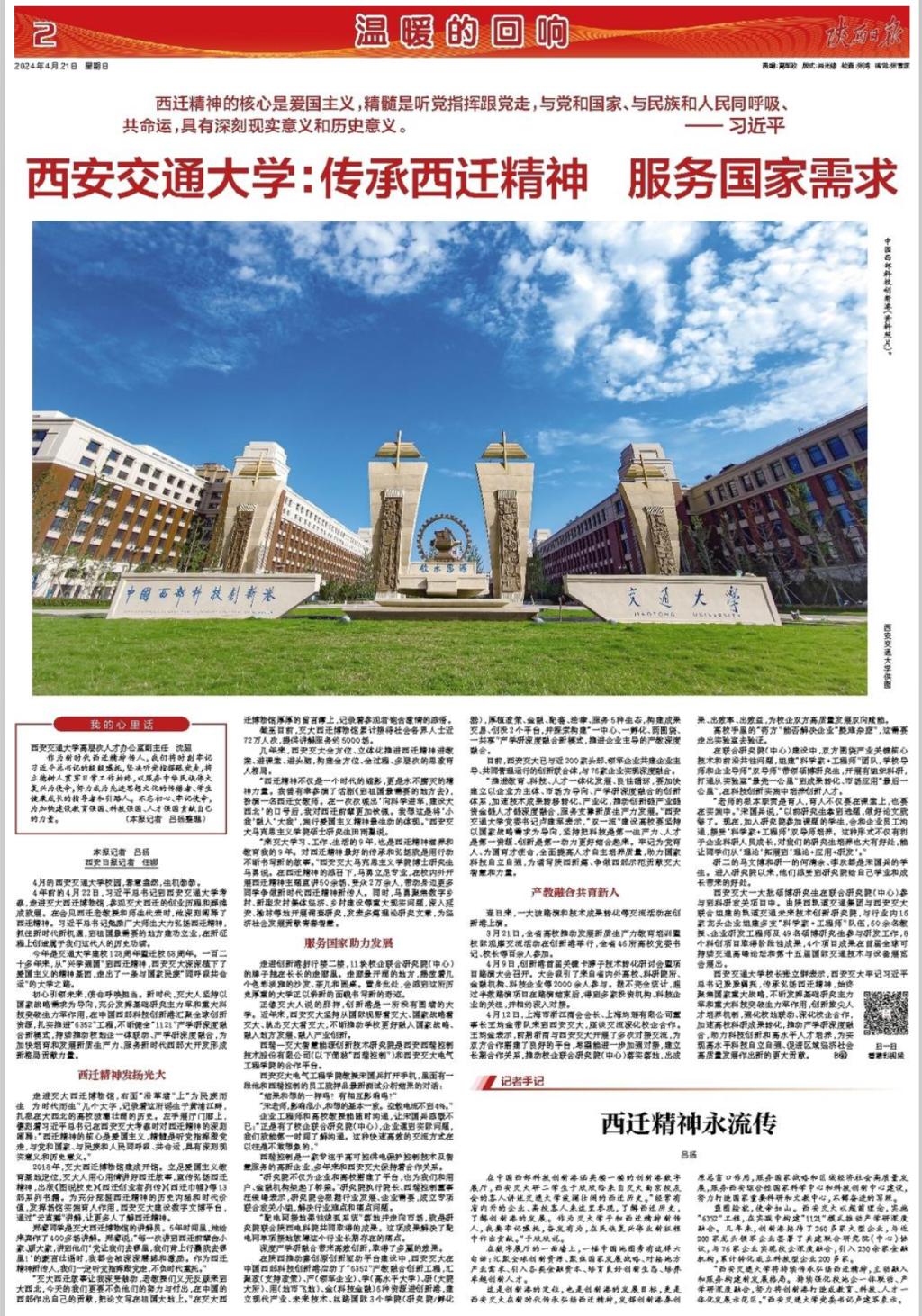 4年前的4月22日,习近平总书记到西安交通大学考察,走进交大西迁博物馆,参观交大西迁的创业历程和辉煌成就展。在会见西迁老教授和师生代表时,他深刻阐释了西迁精神。习近平总书记勉励广大师生大力弘扬西迁精神,抓住新时代新机遇,到祖国最需要的地方建功立业,在新征程上创造属于我们这代人的历史功绩。