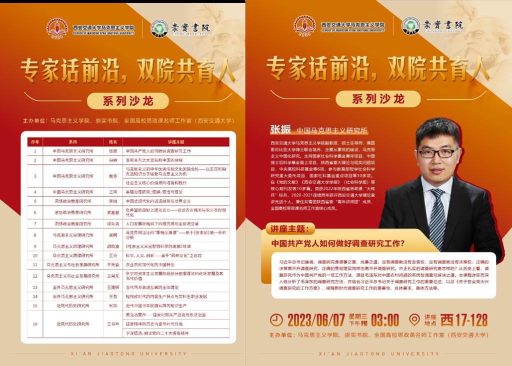 专家话前沿,拓宽理论视野。对于学业困难的学生,学院和书院共同建立学业困难学生档案,通过分析学生的学习状况,找出存在的问题和困难。马克思主义学院、崇实书院与全国高校思政课名师工作室(西安交通大学)共同推出“专家话前沿,双院共育人”系列沙龙活动,实现教以共进、研以同行,增进学生对理论知识的深化掌握、对专业前沿的探究兴趣。