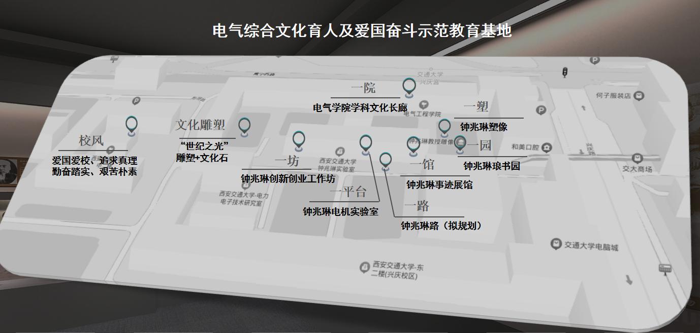 学科文化长廊:百年电气的“精神地标”。在电气学科扎根西部的起点——兴庆校区东一楼,学院依托“文化+”平台项目,精心规划建设了学科文化长廊,以微缩院史形态串联起百年电气的奋斗史:从西迁专列的珍贵影像到国产首台电机的问世,从西迁先贤到国家级教学名师和团队,从手写教材到多版印刷的国家规划获奖教材,从技术参数到大国重器……这不仅是一条展示学院百年发展历程、辉煌成就和杰出先贤的物理空间,更是一个“精神传承、立德树人”的教育基地和“寻根溯源、凝聚力量”的情感家园,生动展现了一代代电气人在西迁先辈的引领下“兴学强国、科教报国”的初心使命与深厚底蕴。这里不仅是师生感悟学科精神、激发奋斗热情、锚定科技报国信仰的重要阵地,更是电气学院倾力打造的以钟兆琳先生为标识的文化育人基地(一塑、一园、一院、一馆、一平台、一坊、一路)的重要组成部分。在中国西部科技创新港,钟兆琳的报告厅落成,时刻激励师生铭记先生“心无小我,胸怀大志”、矢志科教报国的崇高理想。