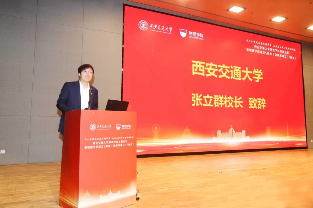 张立群代表西安交大对各级领导、嘉宾、校友的到来表示热烈欢迎和感谢。他谈道,基础研究在推动技术创新和产业持续跨越中具有重要意义,他充分肯定了“十四五”以来,物理学院在人才培养、队伍建设、科学研究等多方面持续取得建设成效。他希望物理学院要以此次学科发展论坛为契机,坚持“四个面向”,从国家急迫需要和长远需求出发,不断提升人才自主培养质量,不断加强基础研究和应用基础研究,不断深化产教融合、协同育人,以更高的站位、更宽的视野、更实的举措支撑拔尖创新人才培养、关键核心技术攻关、科技成果转化和对外开放办学,为学校发展、西部建设和中国式现代化宏伟事业作出新的更大贡献。
